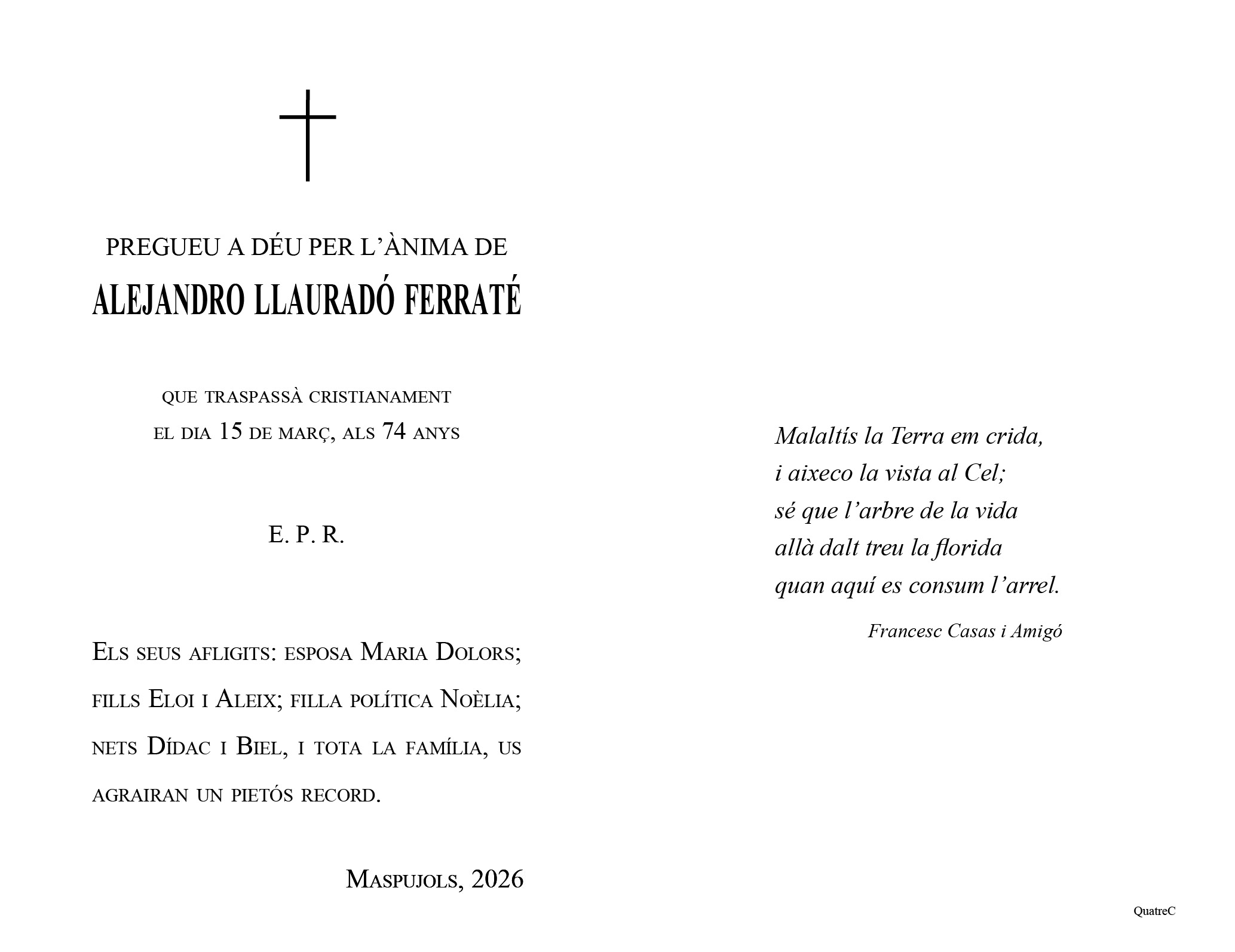 Recordeu que en aquest apartat, podeu trobar la informació concreta dels serveis amb sala de vetlla, així com les diferents possibilitats que teniu a l'abast per participar en el condol i comiat dels nostres difunts. Sempre sota les indicacions i desitjos de les famílies, podeu enviar un condol des d'aquesta pàgina o fins i tot participar en l'homenatge en vida de qui ens ha deixat.