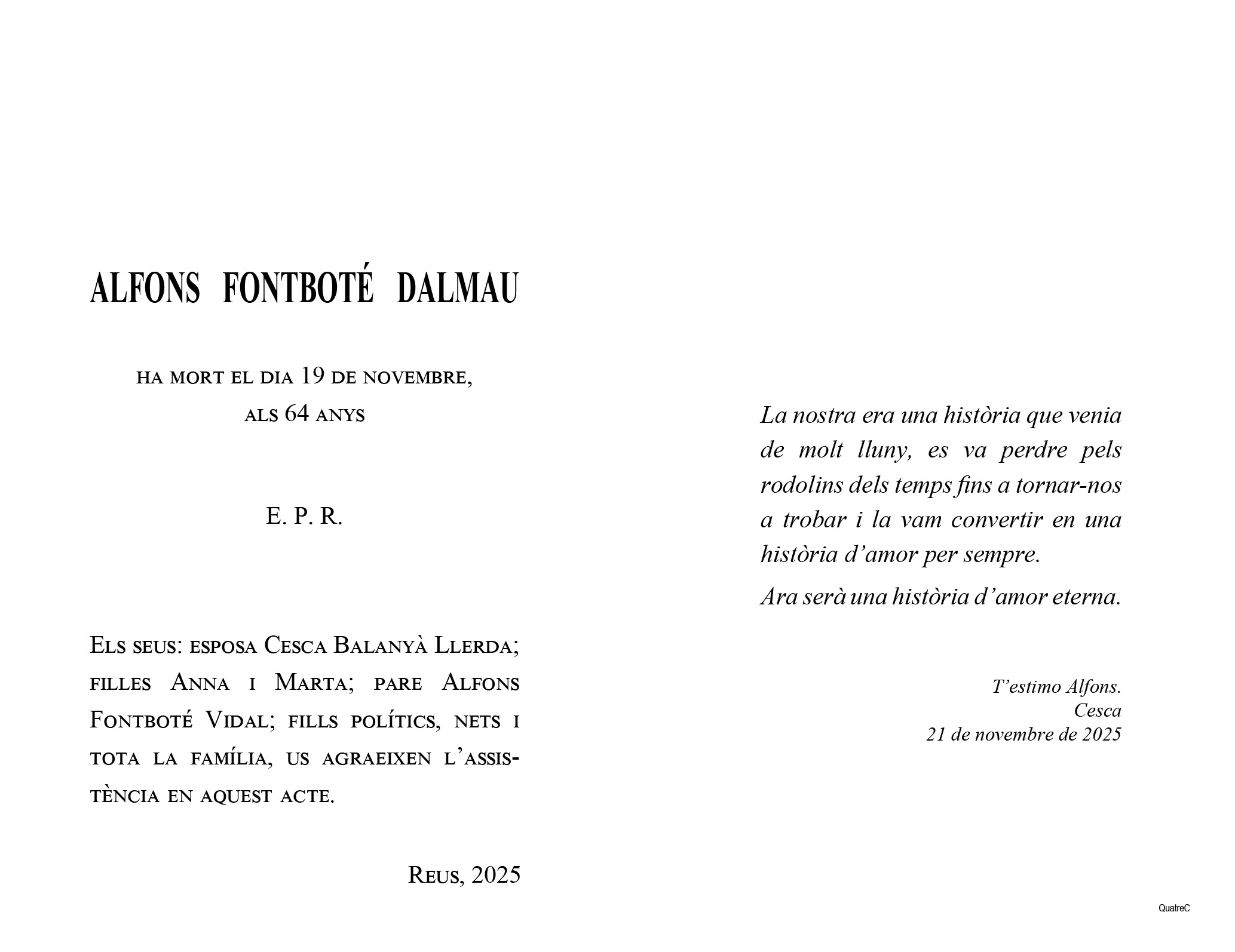 Recordeu que en aquest apartat, podeu trobar la informació concreta dels serveis amb sala de vetlla, així com les diferents possibilitats que teniu a l'abast per participar en el condol i comiat dels nostres difunts. Sempre sota les indicacions i desitjos de les famílies, podeu enviar un condol des d'aquesta pàgina o fins i tot participar en l'homenatge en vida de qui ens ha deixat.