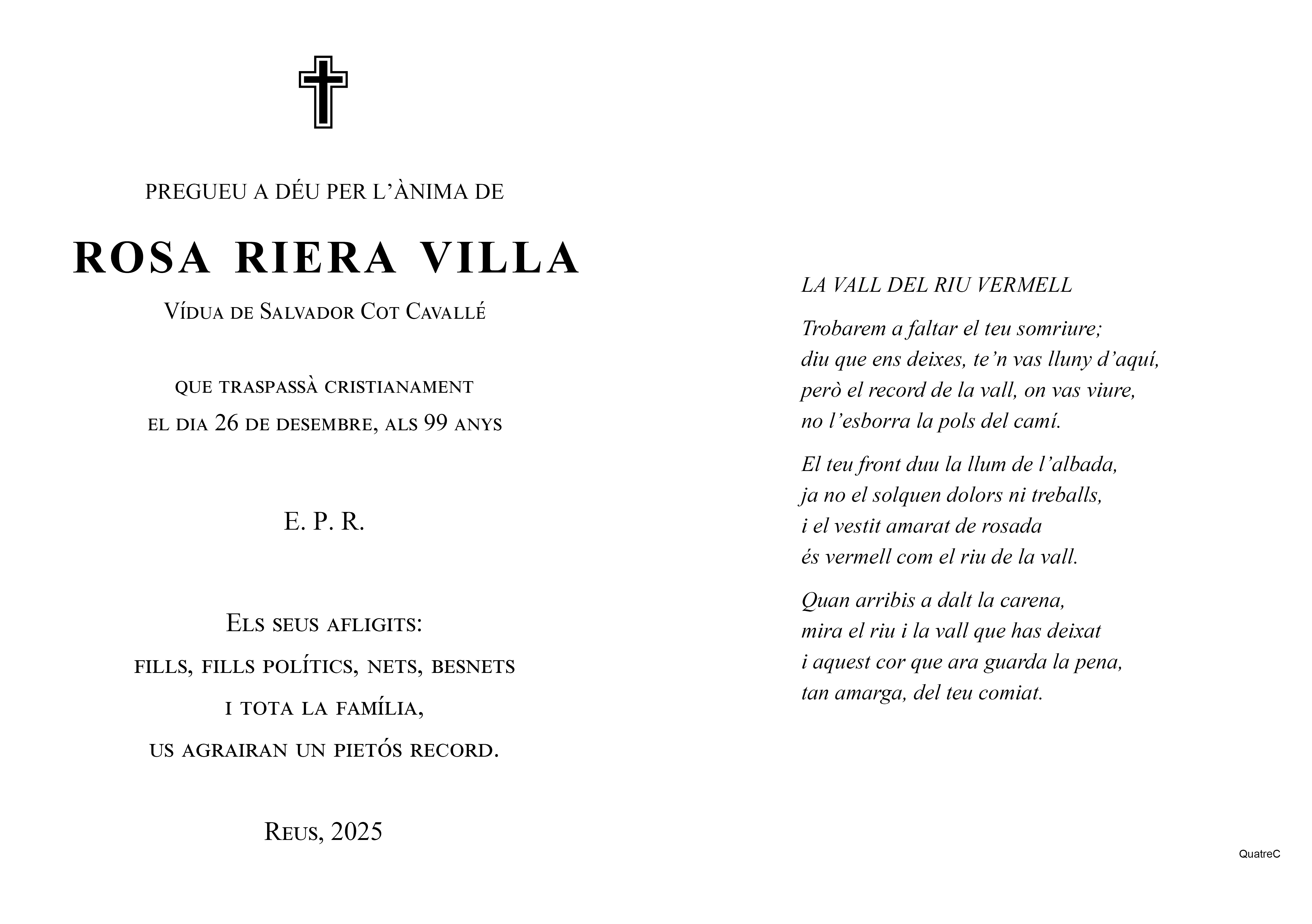 Recordeu que en aquest apartat, podeu trobar la informació concreta dels serveis amb sala de vetlla, així com les diferents possibilitats que teniu a l'abast per participar en el condol i comiat dels nostres difunts. Sempre sota les indicacions i desitjos de les famílies, podeu enviar un condol des d'aquesta pàgina o fins i tot participar en l'homenatge en vida de qui ens ha deixat.