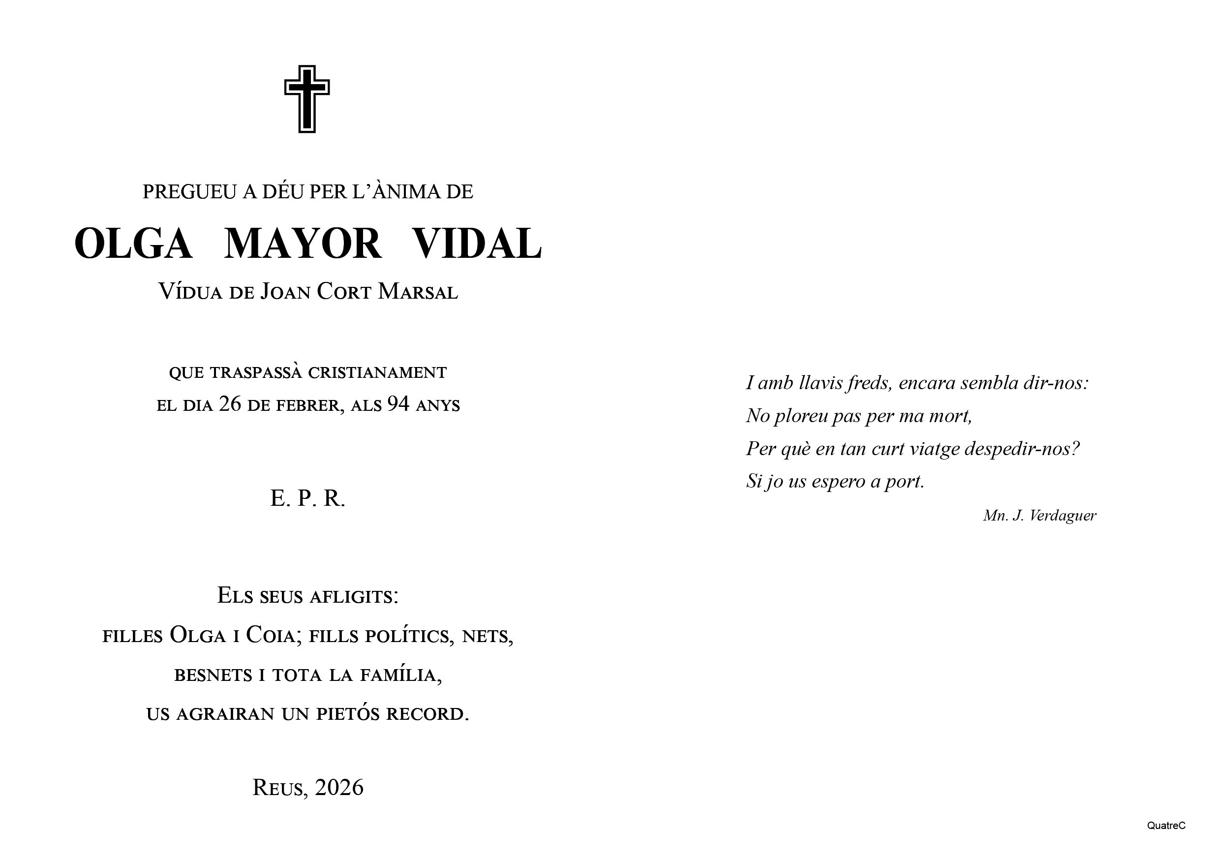 Recordeu que en aquest apartat, podeu trobar la informació concreta dels serveis amb sala de vetlla, així com les diferents possibilitats que teniu a l'abast per participar en el condol i comiat dels nostres difunts. Sempre sota les indicacions i desitjos de les famílies, podeu enviar un condol des d'aquesta pàgina o fins i tot participar en l'homenatge en vida de qui ens ha deixat.