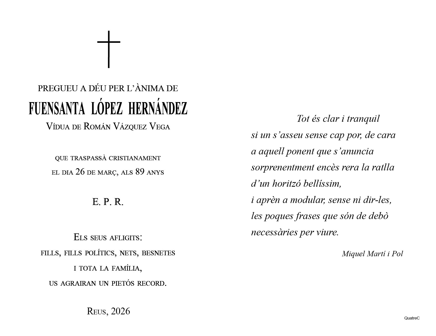 Recordeu que en aquest apartat, podeu trobar la informació concreta dels serveis amb sala de vetlla, així com les diferents possibilitats que teniu a l'abast per participar en el condol i comiat dels nostres difunts. Sempre sota les indicacions i desitjos de les famílies, podeu enviar un condol des d'aquesta pàgina o fins i tot participar en l'homenatge en vida de qui ens ha deixat.