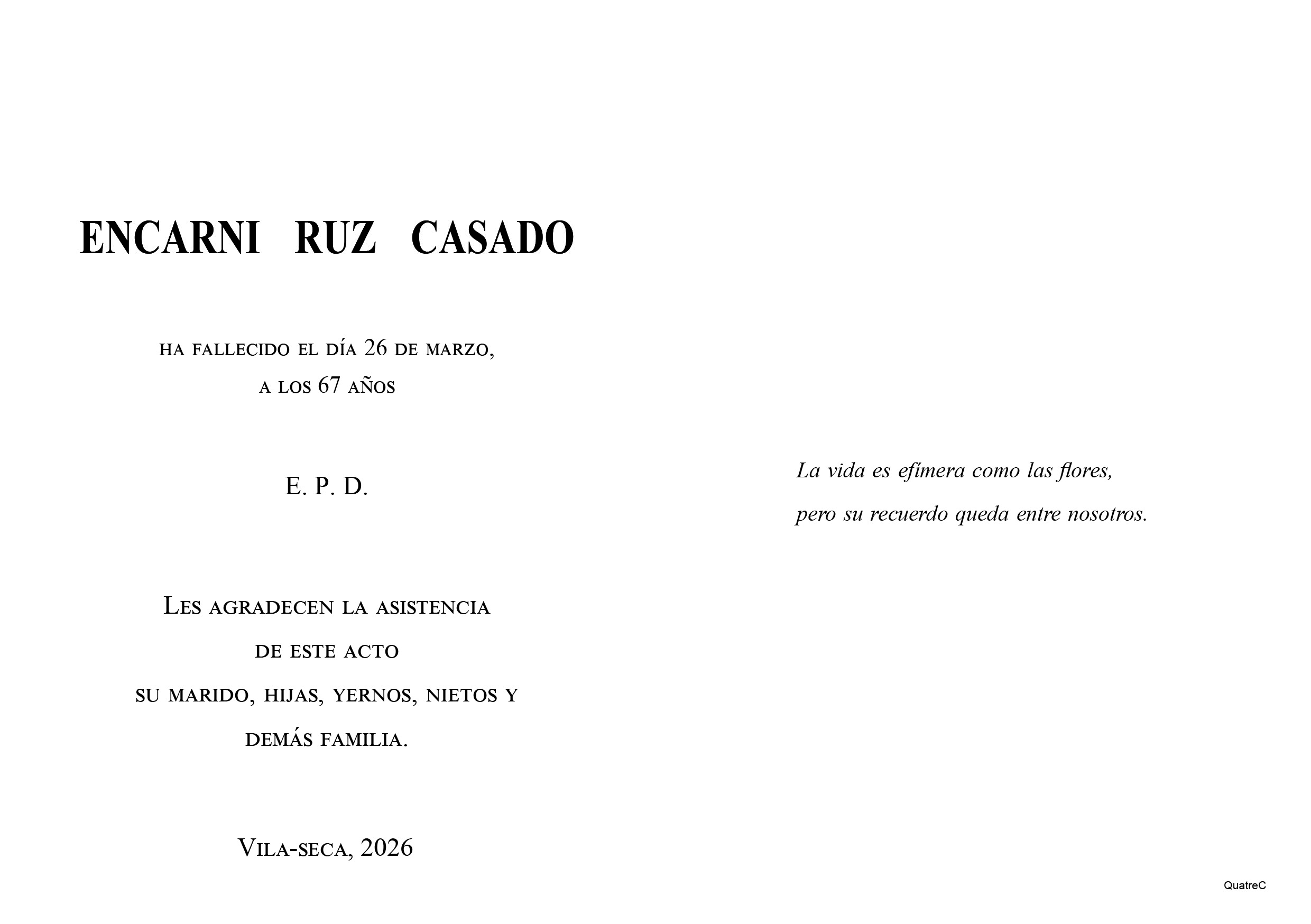 Recordeu que en aquest apartat, podeu trobar la informació concreta dels serveis amb sala de vetlla, així com les diferents possibilitats que teniu a l'abast per participar en el condol i comiat dels nostres difunts. Sempre sota les indicacions i desitjos de les famílies, podeu enviar un condol des d'aquesta pàgina o fins i tot participar en l'homenatge en vida de qui ens ha deixat.