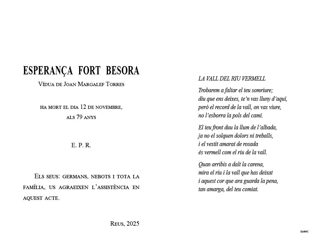 Recordeu que en aquest apartat, podeu trobar la informació concreta dels serveis amb sala de vetlla, així com les diferents possibilitats que teniu a l'abast per participar en el condol i comiat dels nostres difunts. Sempre sota les indicacions i desitjos de les famílies, podeu enviar un condol des d'aquesta pàgina o fins i tot participar en l'homenatge en vida de qui ens ha deixat.