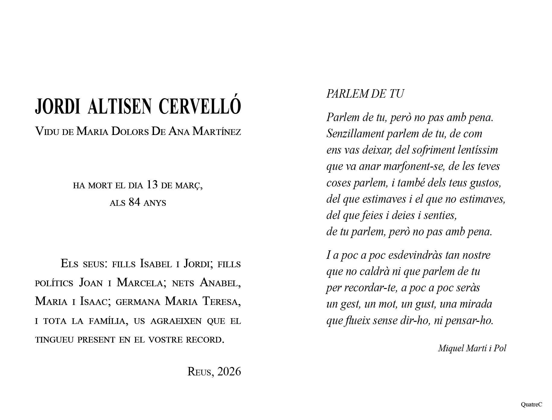 Recordeu que en aquest apartat, podeu trobar la informació concreta dels serveis amb sala de vetlla, així com les diferents possibilitats que teniu a l'abast per participar en el condol i comiat dels nostres difunts. Sempre sota les indicacions i desitjos de les famílies, podeu enviar un condol des d'aquesta pàgina o fins i tot participar en l'homenatge en vida de qui ens ha deixat.